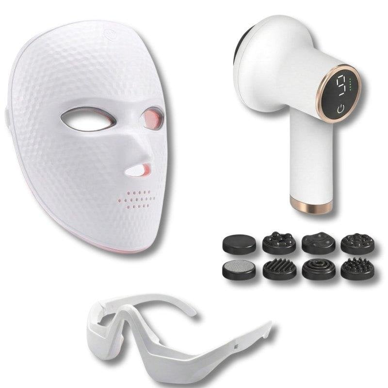 Ganzheitliche Pflege für Gesicht und Körper. Das Set kombiniert eine multifarbige LED-Gesichtsmaske zur Hautregeneration, eine Augenmaske mit EMS und Rotlicht zur Reduktion von Müdigkeitserscheinungen sowie ein Anticellulite-Massagegerät mit 9 Geschwindigkeiten und 8 Aufsätzen für gezielte Körperbehandlung.
