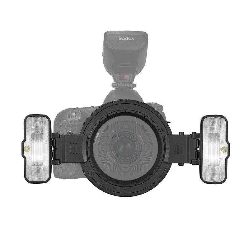 Die Blitzköpfe können um die mitgelieferte Adapterkrone variabel positioniert oder auf separaten Mini-Stativen montiert werden, passend für Objektivdurchmesser von 49–77 mm.