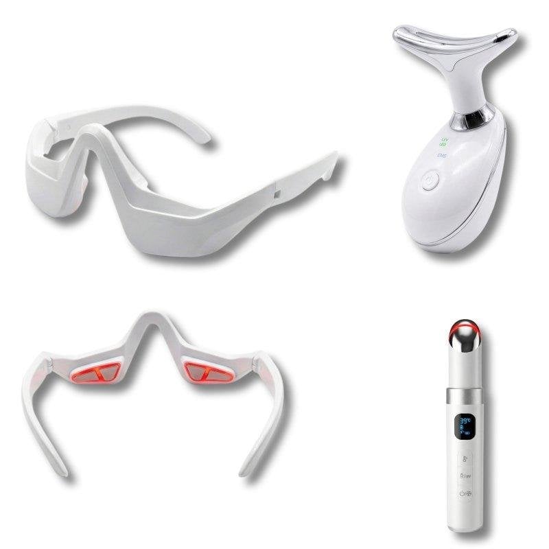 Spezielle Augenpflege: Enthalten ist eine professionelle Augenmaske (EMS, Vibrationen, rotes Licht) zur schnellen Reduktion von Müdigkeitsanzeichen (Augenringe, Schwellungen, feine Linien) sowie ein Anti-Aging-Augenpflegegerät (EMS, Schallvibrationen, Wärme, LED) für ein geglättetes und revitalisiertes Augenbild.
