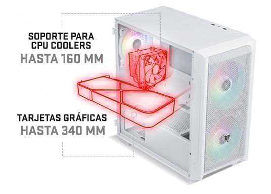 Es unterstützt CPU-Kühler bis zu 160 mm und GPUs bis zu 340 mm (315 mm mit Frontlüftern) und bietet somit eine hohe Kompatibilität und viel Platz.