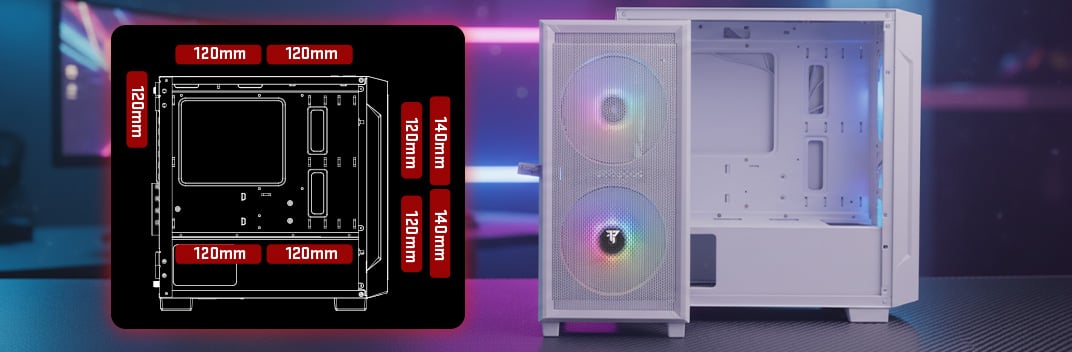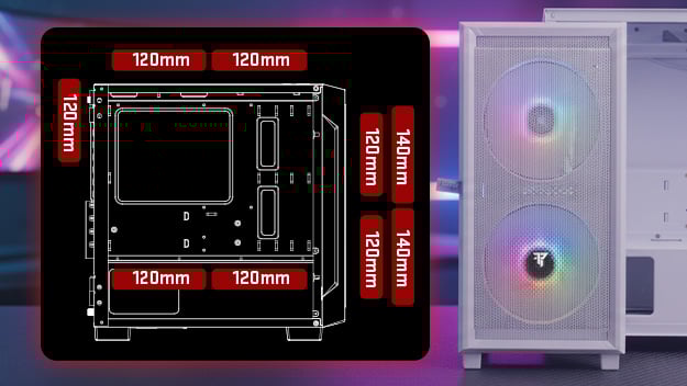 Es bietet mehrere Montagepositionen für 120- oder 140-mm-Lüfter an Vorder-, Ober- und Rückseite sowie einen zusätzlichen Befestigungspunkt an der Netzteilabdeckung, was den Luftstrom verbessert.